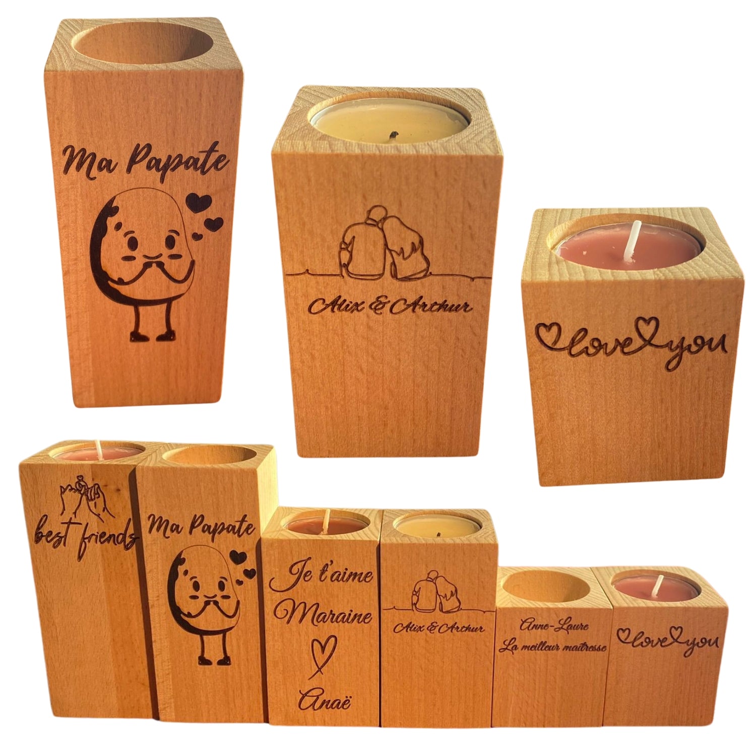 Nous travaillons avec des bois de qualité comme le hêtre et le chêne, des bois sélectionnés pour leur durabilité et leur rendu esthétique après gravure.