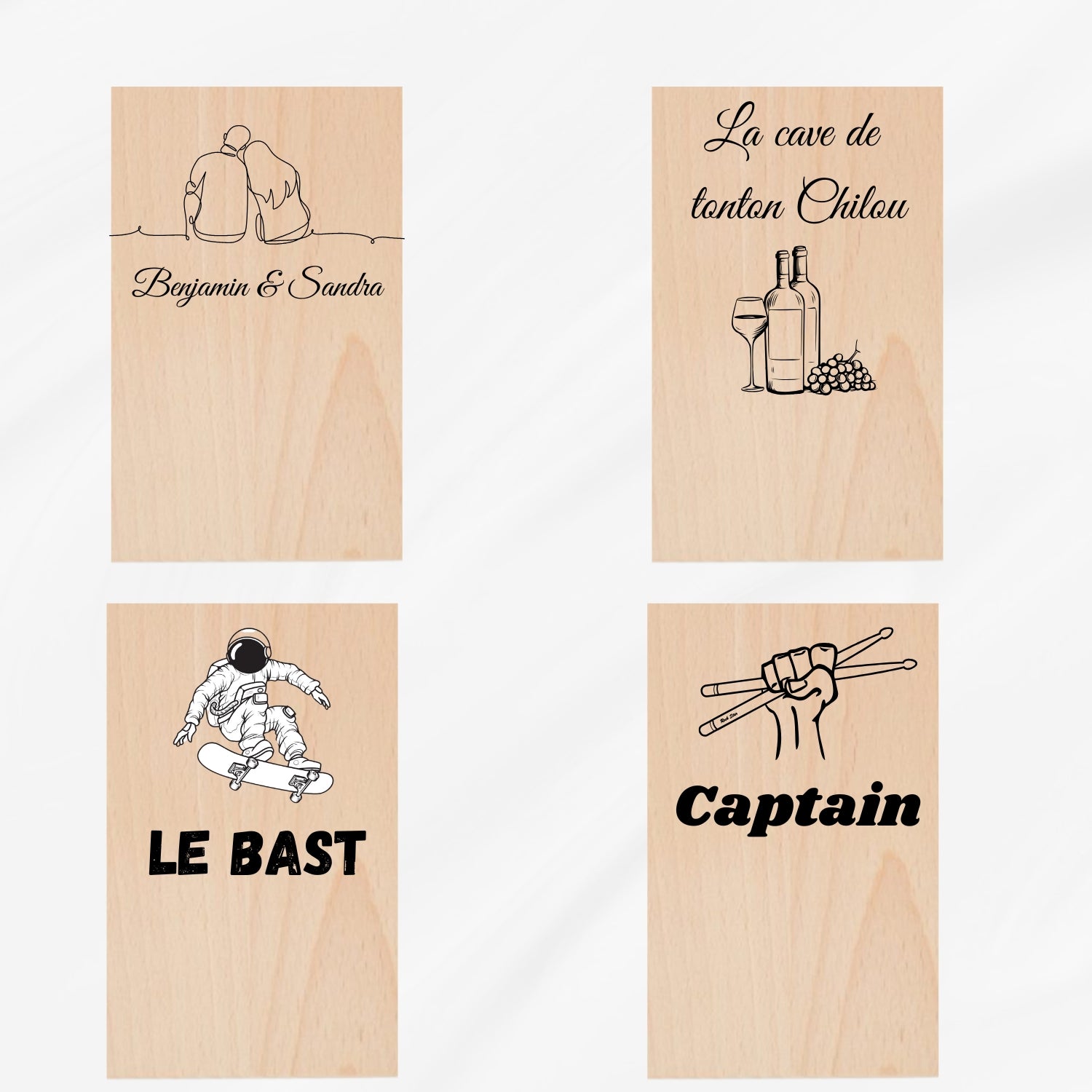 Nous travaillons avec des bois de qualité comme le hêtre et le chêne, des bois sélectionnés pour leur durabilité et leur rendu esthétique après gravure.